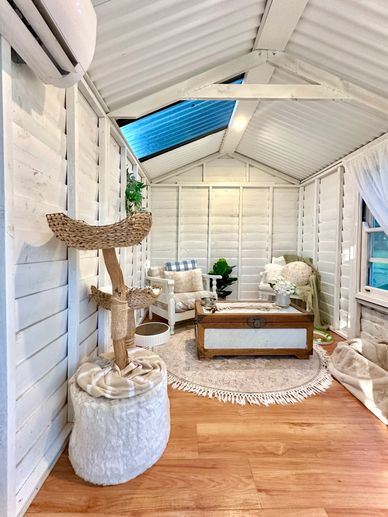 Complete with a multi level plush cat tree / bed, cushions, baskets, woven rug, polished timber floors, timber levels strategically placed throughout to take in the views from one of 4 large secure window and door openings, music and air conditioning.