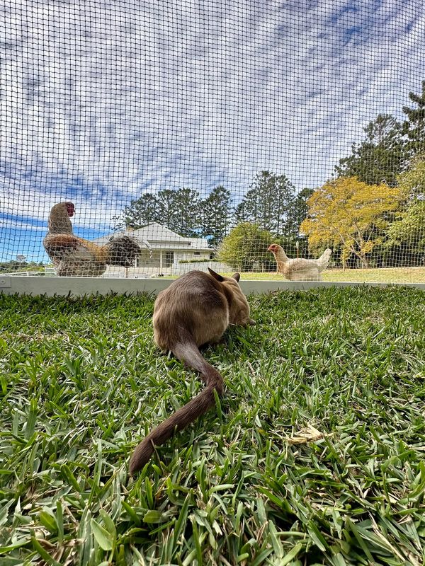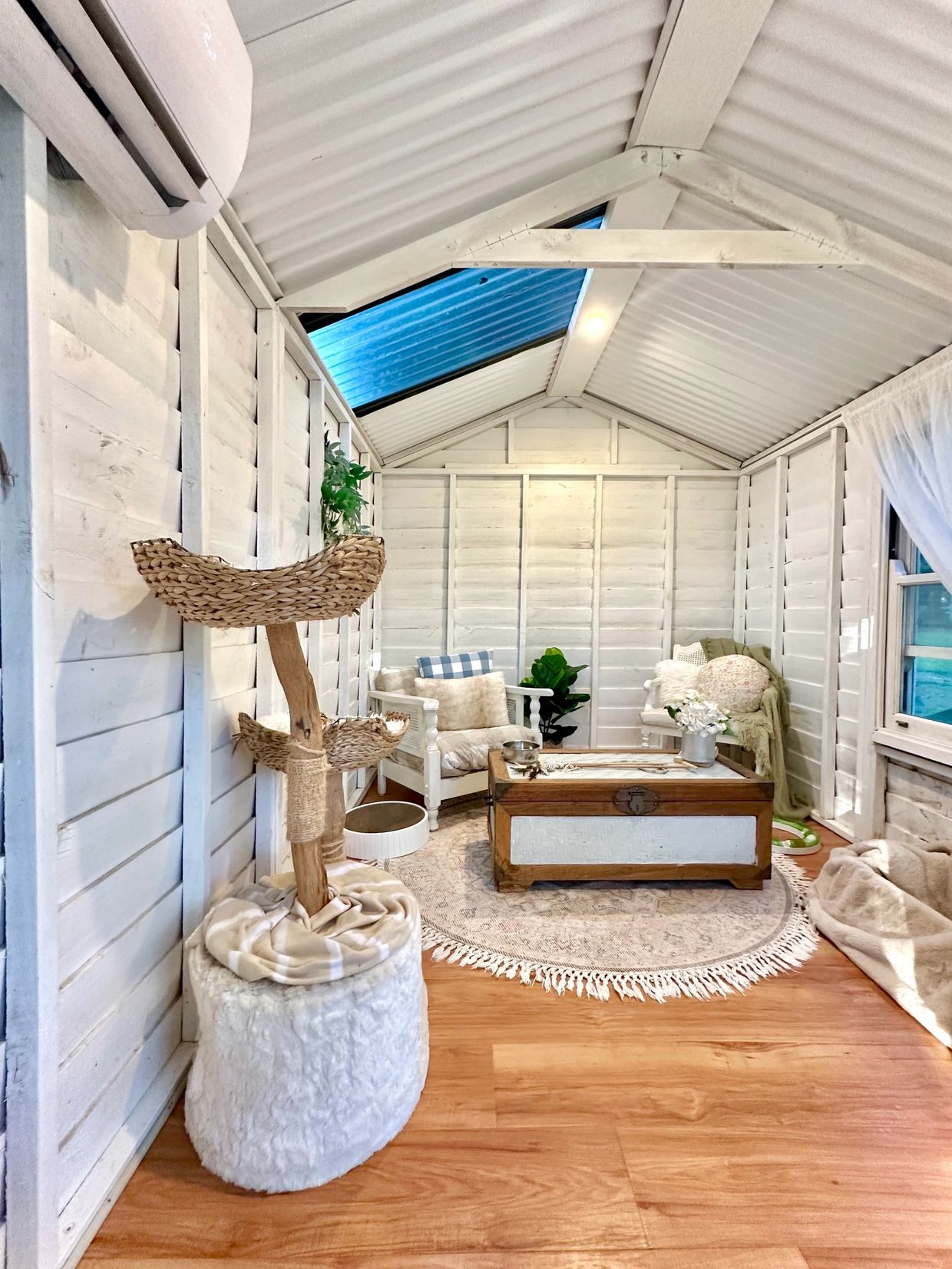 Complete with soft furniture to snooze on 24/7, freedom to walk around, laze on a comfy rug, look out a large window at the many birds that frequent our hoop pine trees and access a purpose built secure grass catio for chicken-watching galore, or perhaps a run on our Fit n Fun brand cat wheel?!